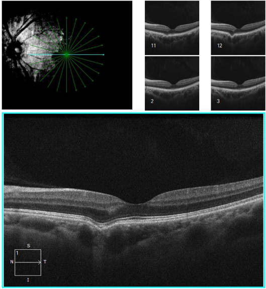 A small focal choroidal excavation in a 35 year old female with moderate myopia. The patient was asymptomatic; BCVA 20/20.