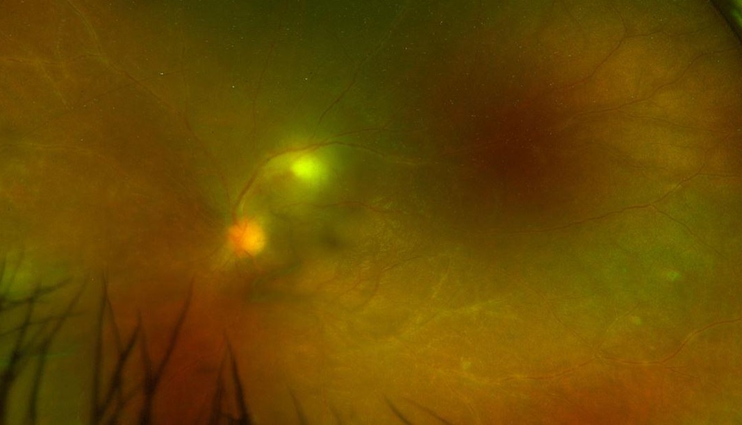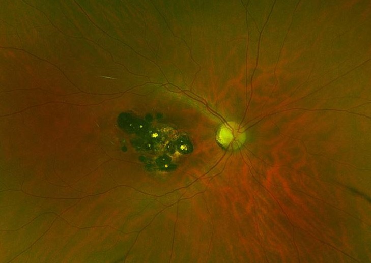 An inactive, chronic toxoplasma macular scar in the right eye of a healthy 23-year-old female patient. She reported to have had poor vision in this eye since very early age.