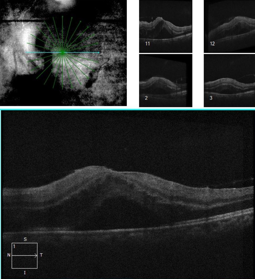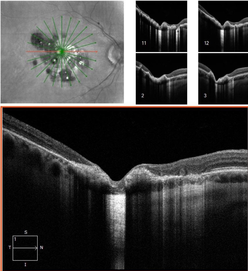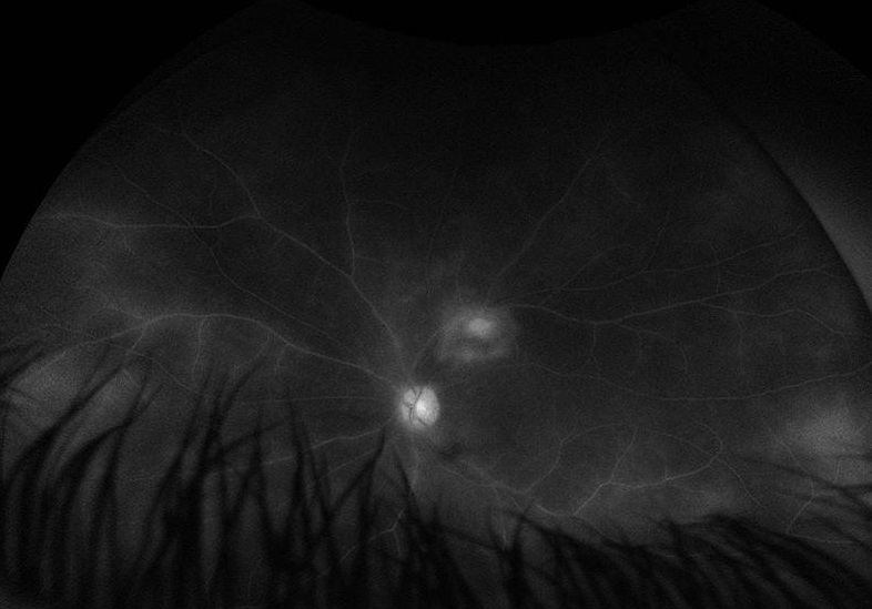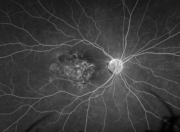 FA shows areas of hyperfluorescence due to windows defects and hypofluoresence due to blocking from pigmented fibrotis tissue as well as staining of the fibrosis in the macula.
