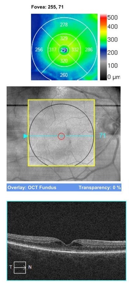 The foveal area demonstrates schitic changes with stellate appearance. There are no overlying epiretinal membrane or posteior hyaloid that would otherwise explain these changes.
